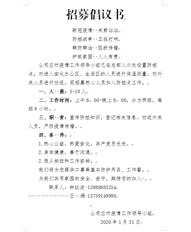 1月31日,公司應(yīng)對疫情工作領(lǐng)導(dǎo)小組在總部發(fā)出《招募倡議書》,增援防控點(diǎn)。截止當(dāng)天17點(diǎn),總部可艷潔、殷宏、趙舒婭、周韋凡、李雁雄、余 虎、張艷梅、李曉江、楊美萍踴躍報(bào)名。