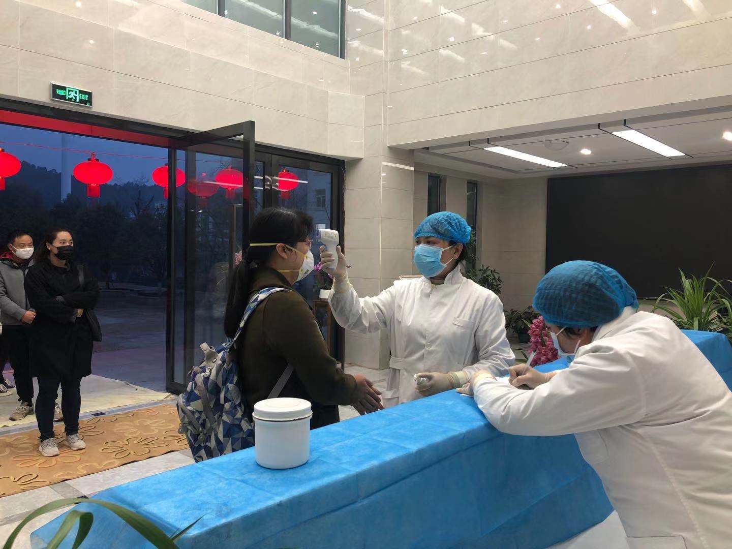 通過(guò)噴過(guò)消毒液的地墊、測(cè)體溫、雙手酒精消毒。