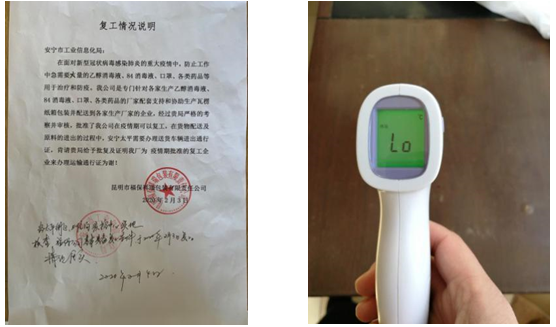 2月3日:1.安寧市工信局對福保祥瑞公司作準(zhǔn)予復(fù)工復(fù)產(chǎn)批復(fù),感到高興;2.安化社區(qū)借旭潤公司1支紅外線測溫儀使用。