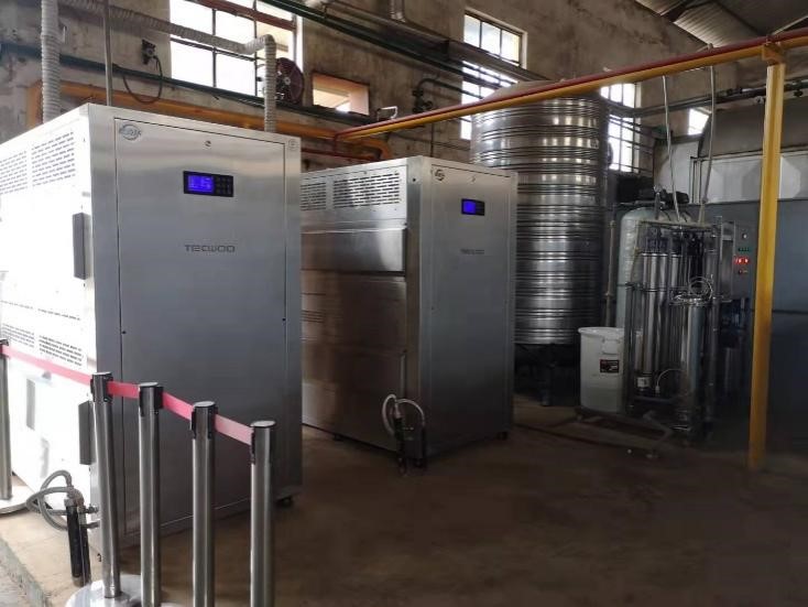 蒸汽熱源機(jī)組由2臺蒸發(fā)量為1t/h的蒸汽熱源機(jī)組成,具有自動(dòng)化程度高、熱效率高、供汽速度快、設(shè)備操作簡單、占地面積較小等特點(diǎn),不僅改善了現(xiàn)場作業(yè)環(huán)境,有效解決了環(huán)保、職業(yè)衛(wèi)生等問題,還實(shí)現(xiàn)了自動(dòng)化、無人化生產(chǎn),滿足安全技術(shù)發(fā)展目標(biāo)要求。目前該設(shè)備已投入使用,運(yùn)行期間各設(shè)備運(yùn)行平穩(wěn),產(chǎn)生的蒸汽壓力約0.6Mpa,到達(dá)用汽點(diǎn)的蒸汽壓力約0.4 Mpa左右,能夠滿足生產(chǎn)線用汽需求。