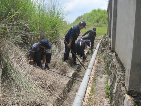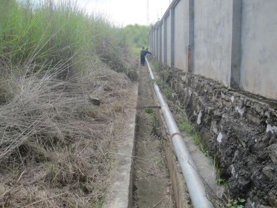 8月8日上午12:15,武定分公司安全質(zhì)量與技術(shù)設(shè)備科接到總庫(kù)區(qū)保衛(wèi)執(zhí)勤人員報(bào)告:604號(hào)庫(kù)斜對(duì)面圍墻腳約50米消防管道(DN200mm)滑落排水溝中,有斷裂、漏水的風(fēng)險(xiǎn),需及時(shí)處理。